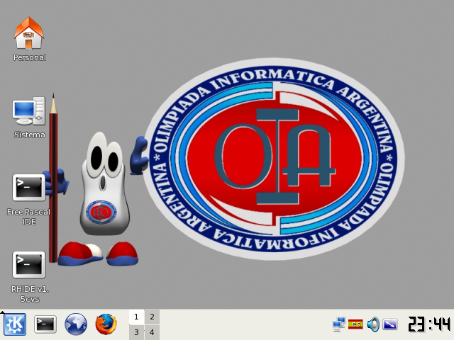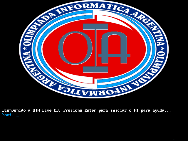 Al iniciar OIAX verá una pantalla como la que se muestra a la derecha. Desde allí podrá pasarle algunas opciones al sistema operativo pero usualmente no hace falta. Luego de unos momentos configurando su equipo el entorno del sistema estará listo, como se muestra en la figura de la izquierda. En el entorno están disponibles el RHIDE y el FreePascal que se utilizarán para la correción en ambiente Linux.